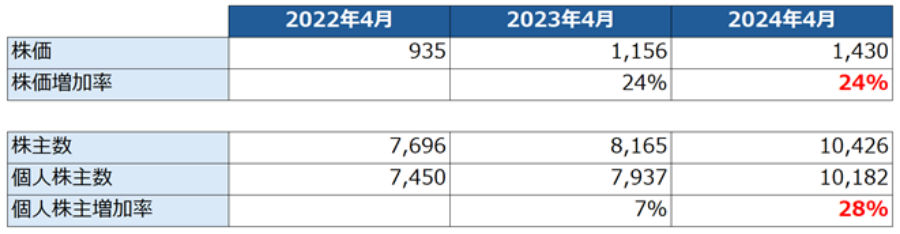 導入前の2023年4月末時点から直近の2024年4月末時点までの間に、株価が約24%上昇しています。また個人株主数が約28%増加しており、全体的な株主数も約27%増に。株主優待の利用実績も想定以上の数を記録していて、狙い通りの効果が得られたと感じています。 -