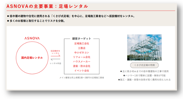 愛知県名古屋市に本社を置く、くさび緊結式足場のレンタルを主軸事業とする株式会社ASNOVA。2022年4月の名古屋証券取引所ネクスト市場上場後に「プレミアム優待倶楽部」を導入されました。社員が中心となって策定したパーパスや自社事業の社会的価値を社外にも知ってほしいが、足場レンタルという一般的にイメージしにくい事業がその道を阻んでいると頭を悩ませていたとのこと。個人投資家が株を購入する理由は何かという切り口でIR施策を検討された経緯や、プレミアム優待倶楽部導入約1年間の成果を経営企画室で広報・IRを担当する阿南様に伺いました。